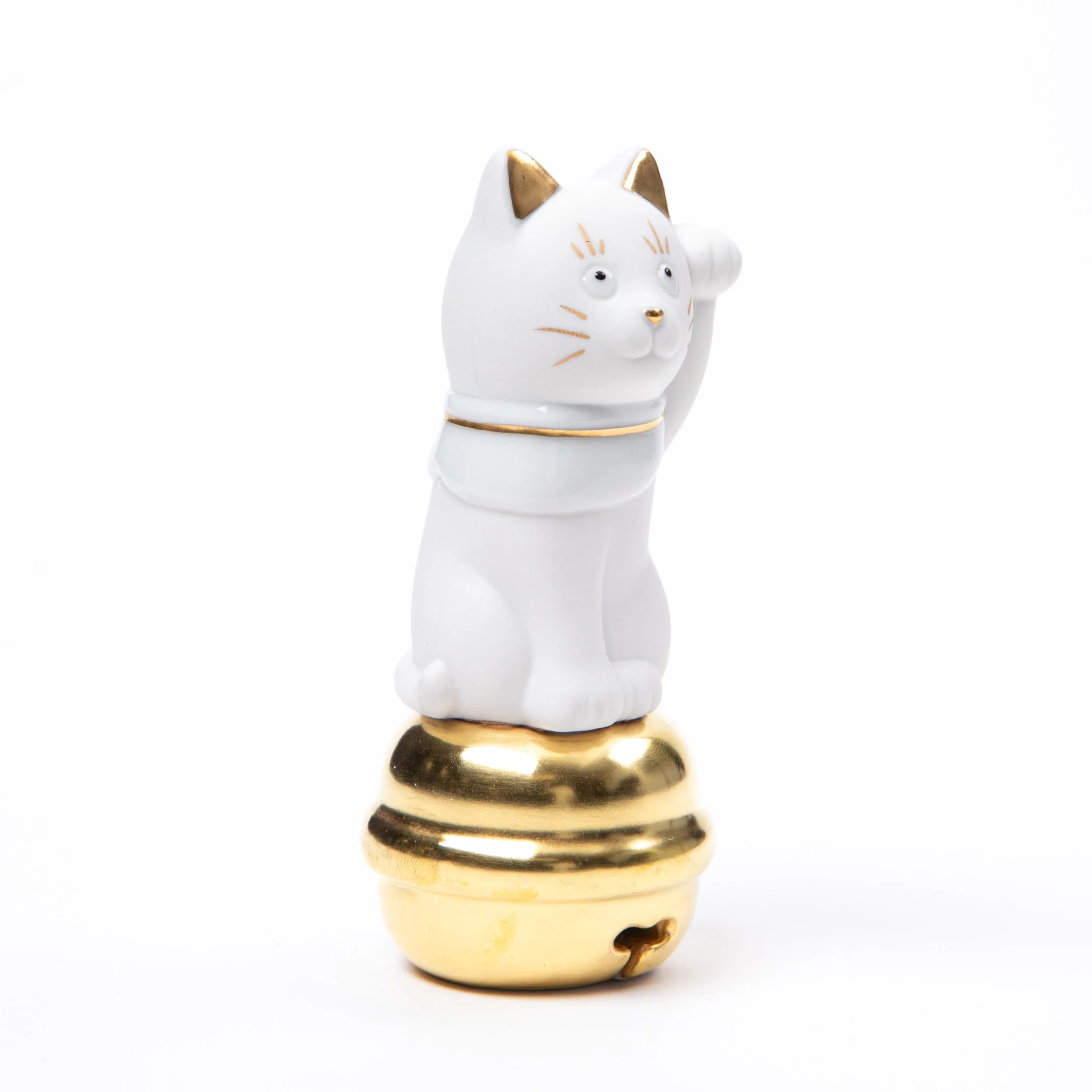 The bell, also crafted from Kutani porcelain, emits a gentle chime when moved, adding an interactive element to the piece. The Maneki Neko is adorned with a simple yet elegant design, including a charming bow on its back, reflecting the kiln's dedication to both tradition and contemporary aesthetics.